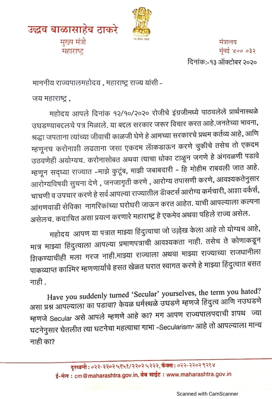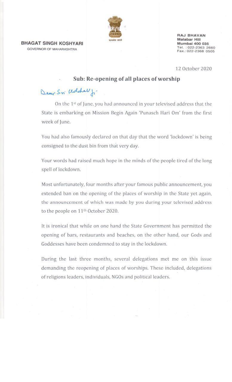 महोदय आपले दिनांक १२।१०।२० रोजीचे इंग्रजीमध्ये पाठवलेले प्रार्थनास्थळे उघडण्याबद्दलचे पत्र मिळाले. या बद्दल सरकार जरूर विचार करत आहे.जनतेच्या भावना, श्रद्धा जपताना त्यांच्या जीवाची काळजी घेणे हे आमच्या सरकारचे प्रथम कर्तव्य आहे, आणि म्हणूनच करोनाशी लढताना जसा एकदम लॅाकडाऊन करणे चुकीचे तसेच तो एकदम उठवणेही अयोग्यच. करोनासोबत अथवा त्याचा धोका टाळून जगणे हे अंगवळणी पडावे म्हणून सद्ध्या राज्यात ‘माझे कुटूंब, माझी जबाबदारी ‘ हि मोहीम राबवली जात आहे. आरोग्यविषयी सुचना देणे , जनजागृती करणे , आरोग्य तपासणी करणे, आवश्यकतेनुसार चाचणी व उपचार करणे हे सर्व आपल्या राज्यातील डॅाक्टर्स आरोग्य कर्मचारी, आशा वर्कर्स , आंगणवाडी सेविका नागरिकांच्या घरोघरी जाऊन करत आहेत. याची आपल्याला कल्पना असेलच. कदाचित असा प्रयत्न करणारे महाराष्ट्र हे एकमेव अथवा पहिले राज्य असेल.