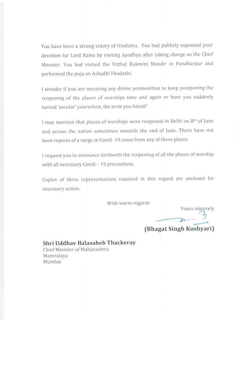 महोदय आपण या पत्रात माझ्या हिंदुत्वाचा जो उल्लेख केला आहे तो योग्यच आहे, मात्र माझ्या हिंदुत्वाला आपल्या प्रमाणपत्राची आवश्यकता नाही. तसेच ते कोणाकडून शिकण्याचीही मला गरज नाही.माझ्या राज्याला अथवा माझ्या राज्याच्या राजधानीला पाकव्याप्त काश्मिर म्हणणार्यांचे हसत खेळत घरात स्वागत करणे हे माझ्या हिंदुत्वात बसत नाही .Have you suddenly turned ‘Secular’ yourselves, the term you hated? असा प्रश्न आपल्याला का पडावा? केवळ धर्मस्थळे उघडणे म्हणजे हिंदुत्व आणि नउघडणे म्हणजे Secular असे आपले म्हणणे आहे का? मग आपण राज्यपालपदाची शपथ ज्या घटनेनुसार घेतलीत त्या घटनेचा महत्वाचा गाभा ‘Secularism’ आहे तो आपल्याला मान्य नाही का?