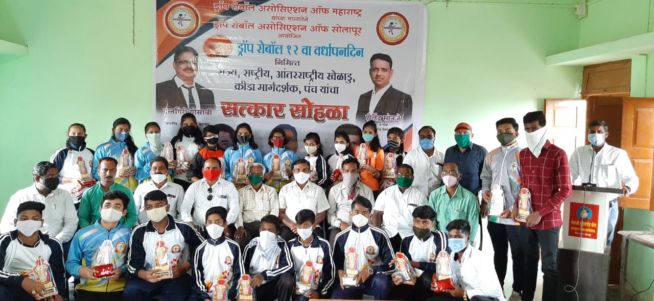 सोलापूर दि.२८ : ड्रॉप रोबॉल असोसिएशन ऑफ सोलापूर यांच्यावतीने बाराव्या वर्धापन दिनानिमित्त शहर-जिल्ह्यातील राज्य, राष्ट्रीय, आंतरराष्ट्रीय २८ खेळाडूंसह मार्गदर्शक व पंचांचा ट्रॉफी देवून सन्मान करण्यात आले.