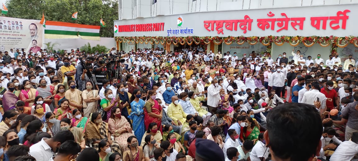 पुणे : उपमुख्यमंत्री अजित पवार यांच्या हस्ते शनिवारी शहर राष्ट्रवादी काँग्रेसच्या कार्यालयाच्या उद्घाटनाचा कार्यक्रम आयोजित करण्यात आला होता. या कार्यक्रमासाठी राष्ट्रवादी काँग्रेसच्या कार्यकर्त्यांची प्रचंड मोठी गर्दी उसळलेली होती.
