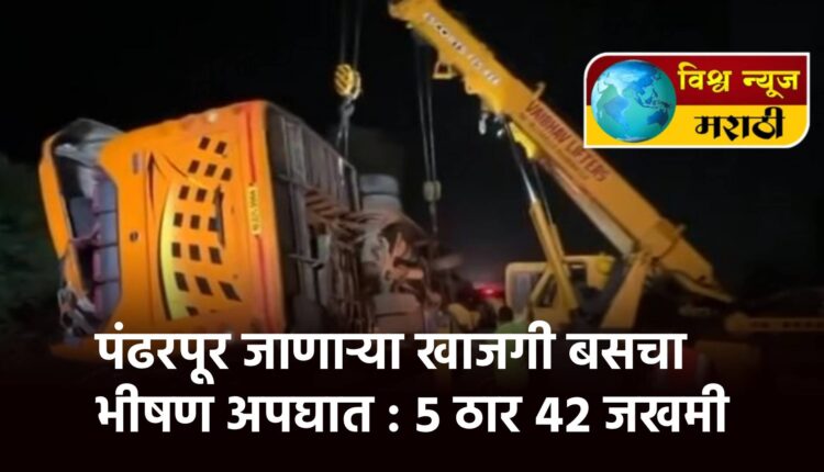 राज्यातील अनेक भाविक आषाढी एकादशीनिमित्त पंढरपूर येथे जात असतांना नुकतेच मुंबई-पुणे महामार्गावर भीषण अपघात झाल्याची धक्कादायक घटना घडली आहे. डोंबिवलीतून पंढरपूरला जाणाऱ्या वारकऱ्यांच्या खासगी बसने ट्रॅक्टरला जोरदार धडक दिली. या अपघातात पाच वारकऱ्यांचा जागीच मृत्यू झाला, तर ४२ जण जखमी झाले. सोमवारी मध्यरात्री पावणे एकच्या सुमारास हा अपघात झाला. जखमींवर पनवेल येथील एमजीएम आणि उपजिल्हा रुग्णालयात उपचार सुरु आहेत.