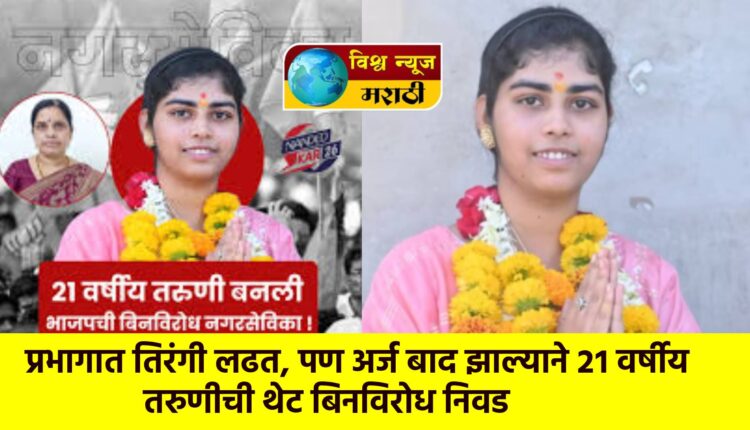 राज्यात सध्या स्थानिक निवडणुकीची धामधूम सुरु असून राज्यातील २४६ नगपरिषदा आणि ४२ नगरपंचायत निवडणुका होण्याअगोदरच अनेक ठिकाणी बिनविरोध निवडणूक झाली आहे. अशातच आता नांदेड जिल्ह्यातील मुखेड नगरपरिषद निवडणुकीतून एका तरुणीची नगरसेवक पदी अवघ्या २१ व्या वर्षी बिनविरोध निवड झाली आहे. या तरुणीचे नाव स्नेहा तमशेट्टे असून तिने नगरसेवक पदी झालेल्या बिनविरोध निवडणुकीची जोरदार चर्चा जिल्ह्यात होत आहे.