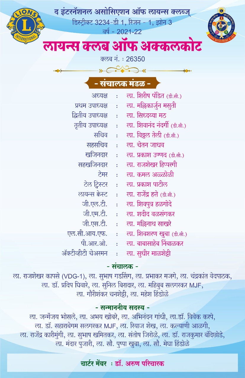 अक्कलकोट, दि.३ : लायन्स क्लब ऑफ अक्कलकोटच्या २०२१ – २२ या वर्षीच्या नूतन अध्यक्षपदी शिरीष पंडित यांची तर सचिवपदी विठ्ठल तेली यांची निवड करण्यात आली.यात प्रथम उपाध्यक्ष म्हणून मल्लिकार्जून मसुती,द्वितीय उपाध्यक्ष सिद्धय्या मठ,तृतीय उपाध्यक्ष शिवानंद नंदर्गी, सहसचिव चेतन जाधव, खजिनदार प्रकाश उन्नद,सहखजिनदार राजशेखर हिप्परगी, कमल अळळोळी, प्रकाश पाटील, राजेंद्र हत्ते,शिवपुत्र हळगोदे, शदिद वळसंगकर, मल्लिनाथ साखरे, शिवशरण खुबा, बाबासाहेब निंबाळकर, सुधीर माळशेट्टी आदी मान्यवरांचा पदग्रहण सोहळा होणार आहे.