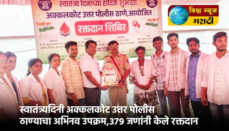७९ व्या स्वातंत्र्यदिनानिमित्त अक्कलकोट उत्तर पोलीस ठाणे येथे विशेष रक्तदान शिबिराचे आयोजन करण्यात आले. या शिबिरात तब्बल ३७९ रक्तदात्यांनी उत्स्फूर्तपणे रक्तदान करून समाजाप्रती आपले कर्तव्य बजावले.