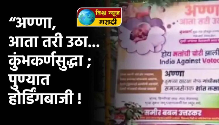 त्यात म्हटले आहे की, “अण्णा, आता तरी उठा… कुंभकर्णसुद्धा गाढ झोपेतून रावणासाठी आणि लंकेसाठी उठला होता. तुम्ही आपल्या देशासाठी आता तरी उठा. होय, मतांची चोरी झाली आहे. इंडिया अगेन्स्ट व्होटचोरी. देशात मतांची चोरी होत असताना, भ्रष्टाचार फोफावला असताना, देशात हुकूमशाही माजलेली असताना, लोकशाही धोक्यात असताना अण्णा, तुमच्यासारखा ज्येष्ठ गांधीवादी समाजसेवक शांत कसा,’ असा सवाल पोस्टरमधून करण्यात आला आहे. दरम्यान, अण्णांनी याला उत्तर दिले असून मी काम करत राहावं आणि तुम्ही झोपून राहावं ही अपेक्षा चुकीची आहे. केवळ बोटं दाखवून हे करा ते करा असे करून होणार नाही. तरुणांनी जागं होऊन आंदोलन करावे, असेही ते म्हणाले.