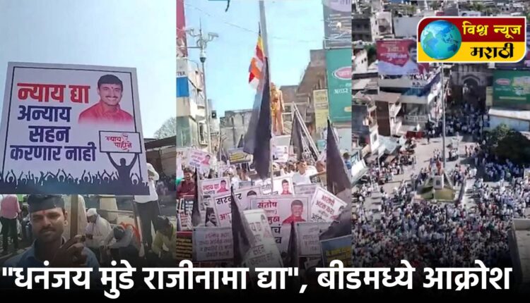 सरपंच संतोष देशमुख यांच्या हत्येच्या निषेधार्थ आज बीडमध्ये सर्वपक्षीय, सर्व धर्मीयांचा जिल्हाधिकारी कार्यालयावर मोर्चा दाखल झाला होता. काळ्या फिती लावून, काळे झेंडे हातात घेऊन हजारो लोक या मोर्चात सहभागी झाले होते. या मोर्च्यात महिला, ज्येष्ठ नागरीक, तरुण मोठ्या संख्येने हजर झाले आहेत. या मोर्चातून एकच मागणी करण्यात येत आहे, ती म्हणजे वाल्मिकी कराडला अटक करा. धनंजय मुंडे राजीनामा द्या… प्रत्येक मोर्चेकऱ्यांच्या तोंडी ही एकच मागणी आहे. सर्वजण या हत्येच्या विरोधात संताप व्यक्त करत आहेत.