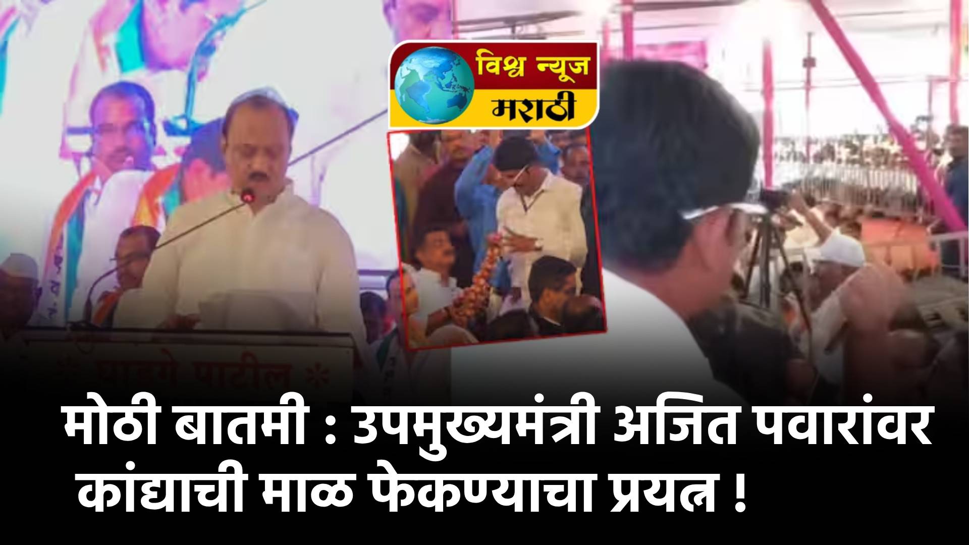 श्रीगोंदा येथे शेतकरी मेळाव्यात बोलताना अजित पवार यांना कांद्याच्या मुद्द्यावर बोलण्याची विनंती केली. मात्र, अजित पवारांनी यावर एक शब्दही बोलला नाही. अजित पवारांचे भाषण सुरू असताना काही कार्यकर्ते हातात कांद्याची माळ घेऊन आले होते. एका कार्यकर्त्याने हातातील माळ फिरवली आणि अजित पवारांच्या दिशेने भिरकावण्याचा प्रयत्न केला. मात्र, वेळीच तेथील एकाने या संभाजी ब्रिगेडच्या कार्यकर्त्याला रोखले. त्यानंतर संभाजी ब्रिगेडचे जिल्हाध्यक्ष अरविंद कापसे आणि तालुकाध्यक्ष नाना शिंदे यांना पोलिसांनी ताब्यात घेतले आहे.