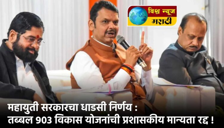 राज्यातील महायुती सरकारचे मुख्यमंत्री देवेंद्र फडणवीस यांच्या नेतृत्वाखाली सरकारने मोठा आणि धाडसी निर्णय घेतला आहे. राज्यातील तब्बल 903 विकास योजनांची प्रशासकीय मान्यता रद्द करण्यात आली आहे. गेल्या काही वर्षांपासून रखडलेल्या आणि प्रत्यक्षात कोणतीही प्रगती न झालेल्या योजनांना यामध्ये समाविष्ट करण्यात आले आहे. मृद व जलसंधारण विभागाच्या माध्यमातून हा निर्णय जाहीर करण्यात आला आहे.