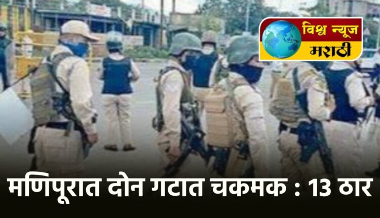 हिंसाचारग्रस्त मणिपूरमध्ये म्यानमारच्या सीमेला लागून असलेल्या तेंगनौपाल जिल्ह्यात सोमवारी अतिरेक्यांच्या दोन गटांत उडालेल्या चकमकीत १३ ठार, तर अनेक जण जखमी झाले. कुकी समाजाचा प्रभाव असलेल्या लीथू गावात दुपारच्या सुमारास ही चकमक उडाली. म्यानमारमध्ये जाणाऱ्या एका अतिरेकी गटाच्या सदस्यावर या क्षेत्रात वर्चस्व असलेल्या दुसऱ्या अतिरेकी गटाने घात लावून हल्ला केल्यांनतर चकमक उडाली. या घटनेची माहिती मिळाल्यानंतर सुरक्षा दलाचे पथक या भागात दाखल झाले.