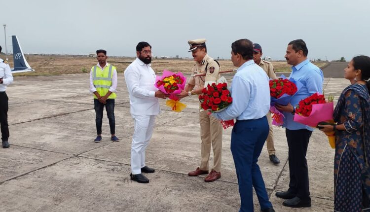 सोलापूर, दि. 25 :- राज्याचे मुख्यमंत्री एकनाथ शिंदे यांचे आज सोलापूर विमानतळ येथे जिल्हावासियांच्यावतीने स्वागत करण्यात आले. यावेळी त्यांच्या समवेत ग्रामविकास व पंचायत राज, वैद्यकीय शिक्षण, क्रीडा व युवक कल्याण मंत्री गिरीश महाजन उपस्थित होते.