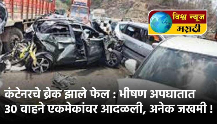 राज्यातील मुंबई- पुणे एक्सप्रेस वेवर बोरघाटात शनिवारी दुपारी भीषण अपघात झाला. ब्रेक फेल झालेल्या कंटेनरने वाहनांना धडक दिली. या भीषण अपघातात 25 ते 30 वाहने एकमेकांवर आदळली असून 30 ते 35 प्रवासी जखमी झाले आहेत. जखमींना खोपोलीतीन नगरपालिका रुग्णालयात दाखल करण्यात आले आहे.