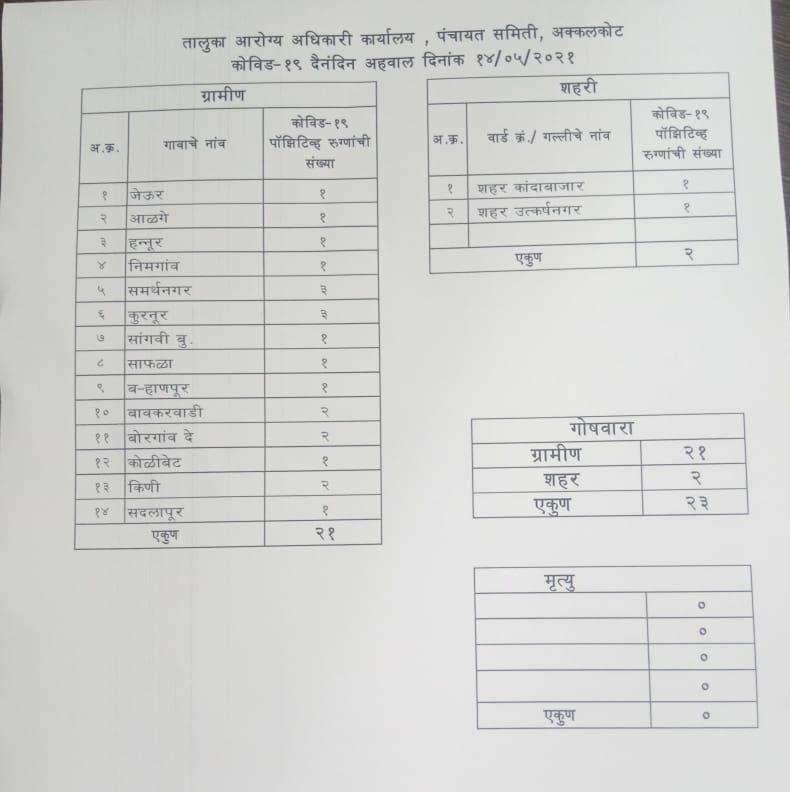 अक्कलकोट तालुक्यात आढळले आज नवे 23 रुग्ण