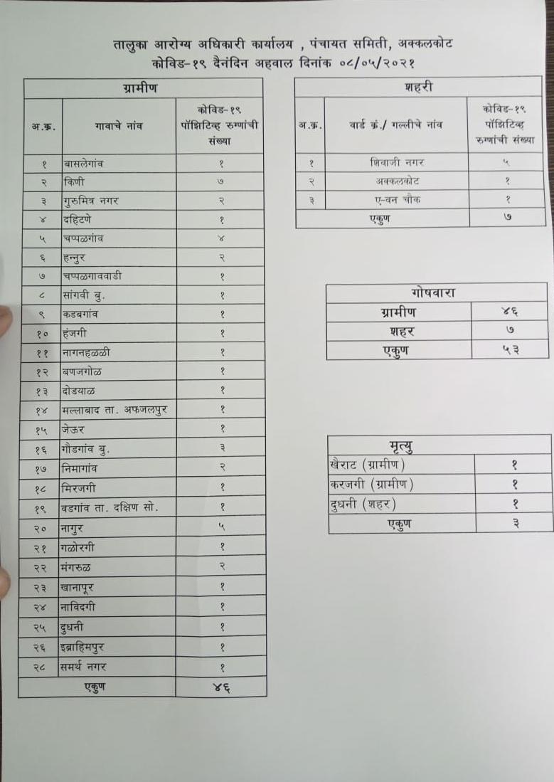 अक्कलकोट तालुक्यात आढळले आज ५३ रुग्ण,तिघांचा मृत्यू अक्कलकोट तालुकासोलापूर जिल्हा By टीम विश्व न्यूज मराठी On May 8, 2021 0 0 Share