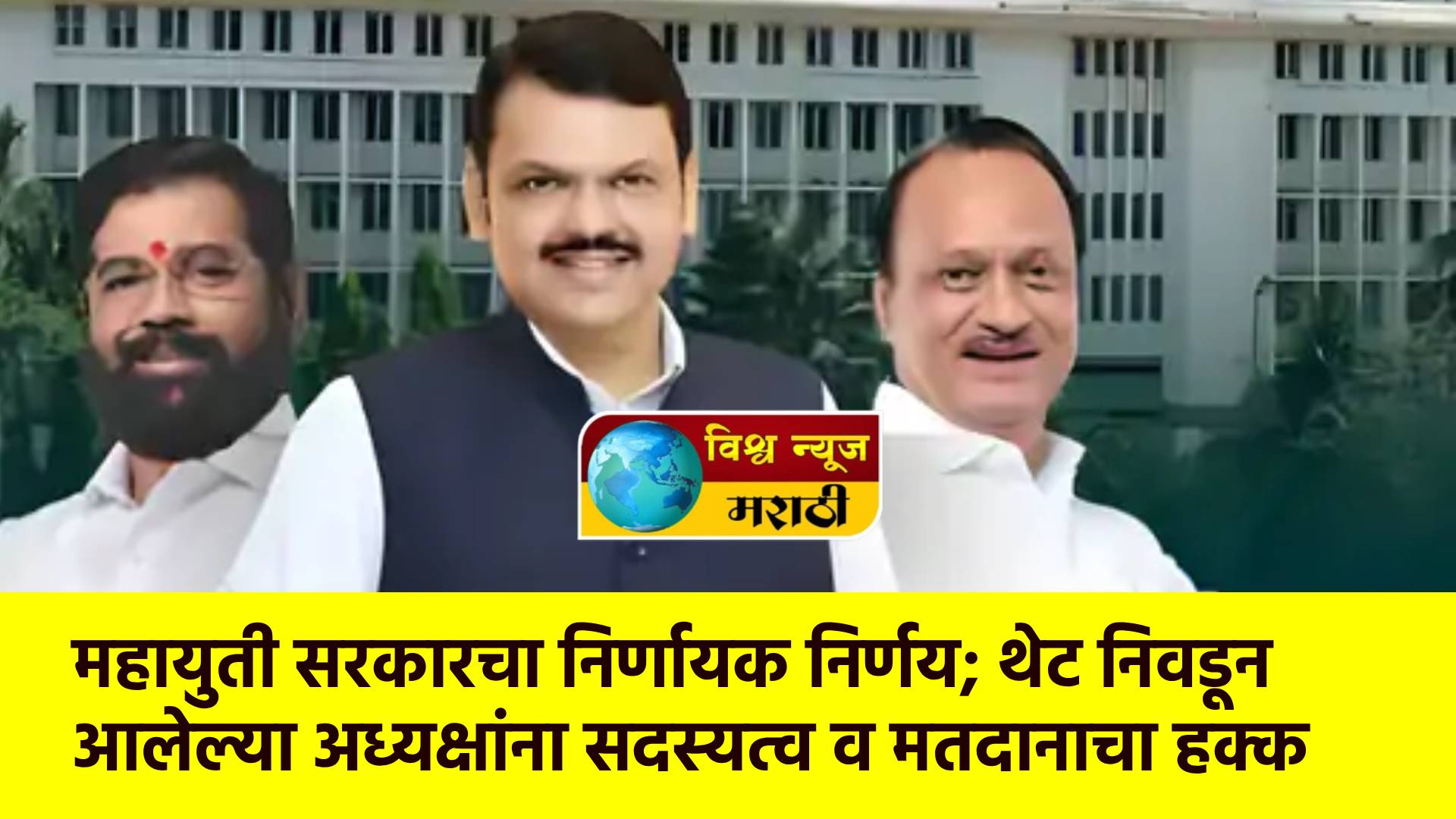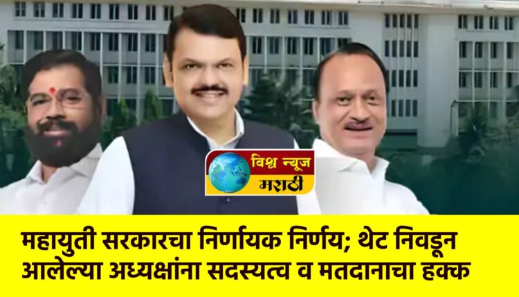 राज्यातील महायुती सरकारने आज झालेल्या मंत्रिमंडळ बैठकीत नगरपरिषदा आणि नगरपंचायतींच्या थेट निवडून आलेल्या अध्यक्षांना सदस्यत्वासह मतदानाचा अधिकार देण्याचा महत्त्वपूर्ण निर्णय घेतला आहे. यासाठी महाराष्ट्र नगरपरिषदा, नगरपंचायती व औद्योगिक नगरी अधिनियम, 1965 मध्ये अध्यादेशाद्वारे सुधारणा करण्यात येणार आहे. या निर्णयामुळे भविष्यात स्थानिक स्वराज्य संस्थांमध्ये बहुमताचा पेच निर्माण झाल्यास अध्यक्षांना थेट मतदान करून निर्णय प्रक्रियेत निर्णायक भूमिका बजावता येणार आहे.