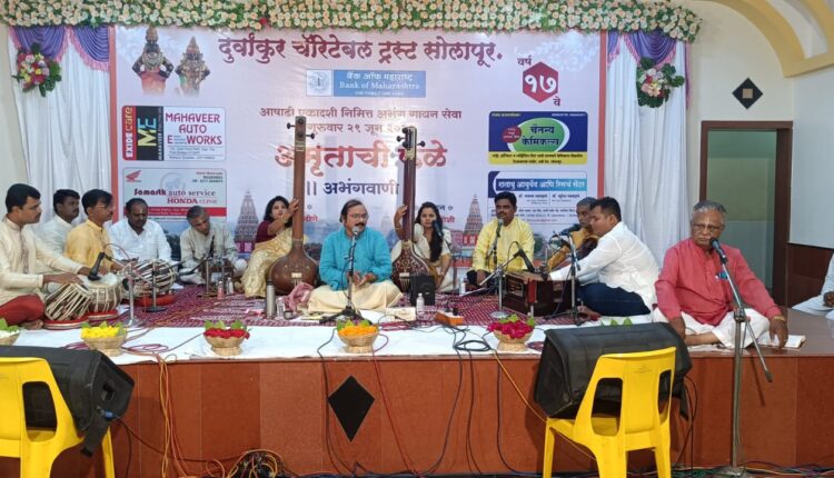 दुर्वांकुर चॅरिटेबल ट्रस्ट, सोलापूरच्या वतीने आयोजित करण्यात आलेल्या या सोहळ्याची सुरूवात, बँक ऑफ महाराष्ट्रचे क्षेत्रीय व्यवस्थापक संजय वाघ, सो.म.पा.स्थायी समितीचे माजी सभापती शिवलिंग कांबळे, उद्योजक महावीर गुंडाळे, संजय अजनसोंडकर, गिरीश माळवदे, डॉ. सुरेश व्यवहारे व डॉ. नयना व्यवहारे आदि मान्यवरांच्या हस्ते विठ्ठल रखुमाईच्या पूजनाने करण्या़त आली. सोलापूर ज्येष्ठ नागरिक संघाचे अध्यक्ष गुरूलिंग कन्नुरकर व शांता कन्नुरकर यांचा भक्तिप्रसार कार्याबद्दल कृतज्ञता सन्मान करण्यात आला. सूत्रसंचालन जगदीश पाटील यांनी केले, तर आभार सोनाली