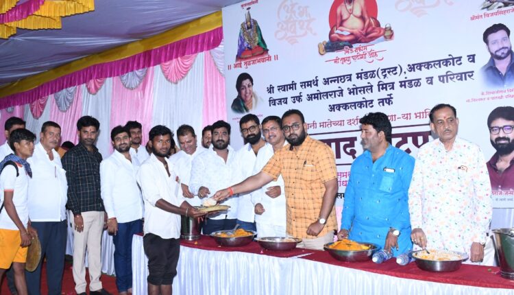 अक्कलकोट, दि.6 : श्री स्वामी समर्थ अन्नछत्र मंडळाचे संस्थापक अध्यक्ष जन्मेजयराजे भोसले यांच्या मार्गदर्शनाखाली व अमोलराजे भोसले यांच्या नेतृत्वाखाली विजय उर्फ अमोलराजे भोसले मित्र मंडळ व परिवार अक्कलकोट यांच्यावतीने श्री तुळजा भवानी मातेच्या दर्शनास जाणार्‍या भाविकांना प्रसाद वाटपाचा शुभारंभ गुरुवारी सायंकाळी वळसंग टोल नाका येथे विविध मान्यवरांच्या हस्ते करण्यात आले.