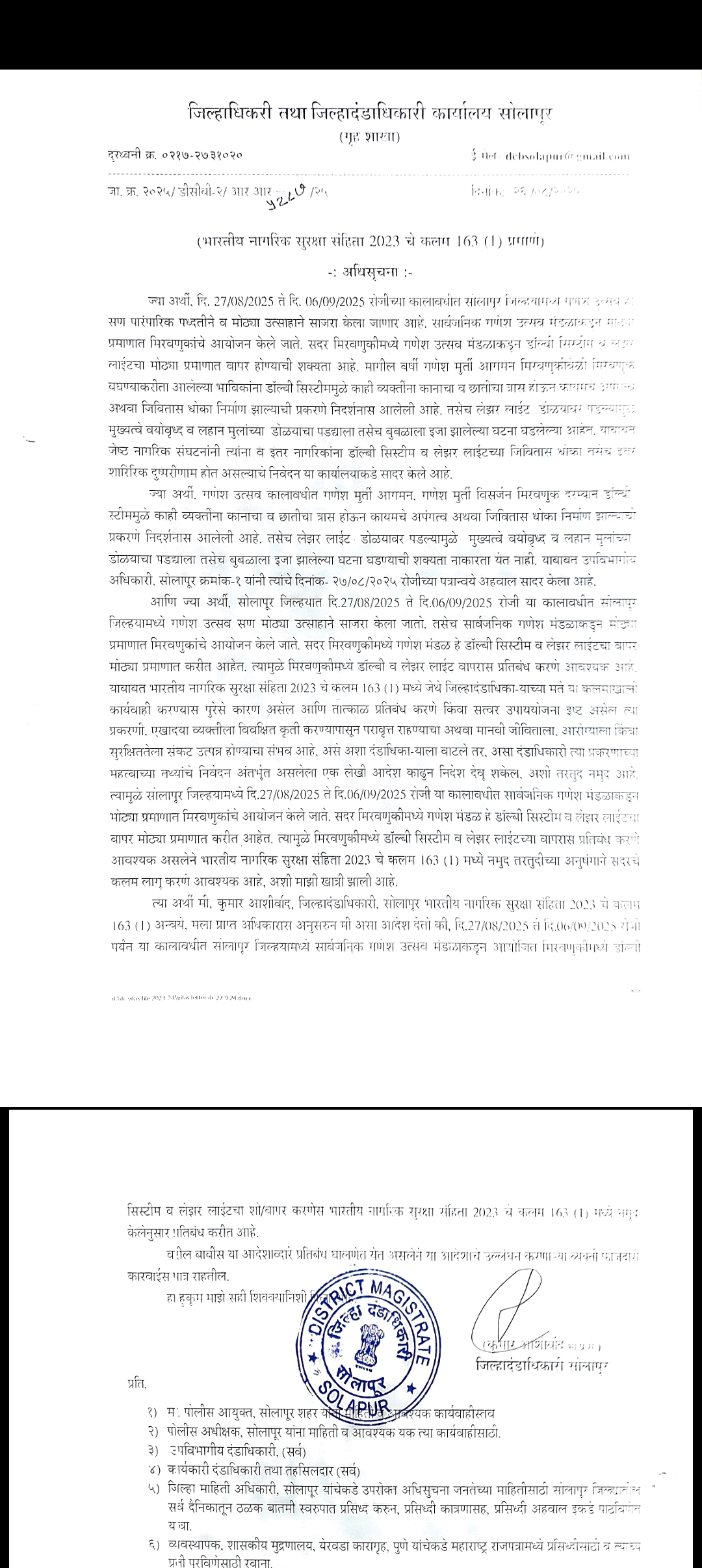 राज्यभरात गणेशोत्सवाची धामधूम सुरु असतांना आता सोलापूर जिल्ह्यामध्ये 27 ऑगस्ट ते सहा सप्टेंबर दरम्यान च्या गणेशोत्सव कालावधीमध्ये डॉल्बी साऊंड सिस्टिम आणि लेझर शोला बंदी घातल्याचा आदेश जिल्हाधिकारी कुमार आशीर्वाद यांनी काढला आहे. त्यामुळे यंदाचा गणेशोत्सव विना डॉल्बी विना लेझर शो आणि पारंपारिक वाद्यांसोबत साजरा होणार यावर शिक्कामोर्तब झाले आहे. दरम्यान जिल्हाधिकारी आशीर्वादाने आपल्या आदेशात काय म्हटले आहे.