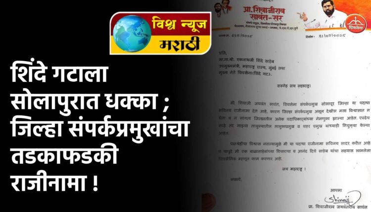राज्याचे उपमुख्यमंत्री एकनाथ शिंदे यांच्या नेतृत्वाखालील शिवसेनेला सोलापूर जिल्ह्यात मोठा धक्का बसला आहे. जिल्ह्याचे संपर्कप्रमुख प्रा. शिवाजीराव सावंत यांनी आपल्या पदाचा तडकाफडकी राजीनामा दिला असून, त्यांनी थेट एकनाथ शिंदे यांच्याकडे आपले राजीनामा पत्र सादर केले आहे.