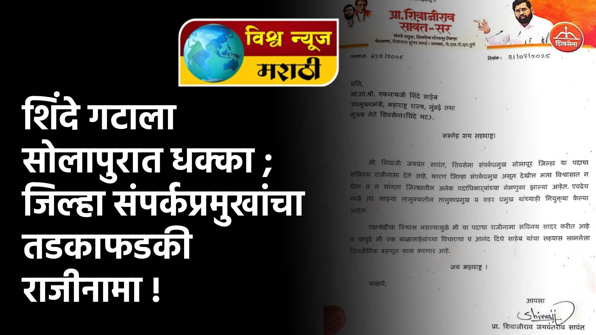या पत्रात सावंत यांनी स्पष्ट नाराजी व्यक्त करत म्हटले आहे की, “सोलापूर जिल्ह्यात पदाधिकाऱ्यांच्या निवडी माझ्याशी कोणतीही चर्चा न करता केल्या गेल्या. माझ्या माढा तालुक्यातील तालुकाध्यक्ष आणि शहरप्रमुख यांचीही निवड परस्पर करण्यात आली. या घडामोडीमुळे पक्षश्रेष्ठींना माझ्यावर विश्वास राहिलेला नाही, हे स्पष्ट होते. त्यामुळे मी राजीनामा देतो.”
