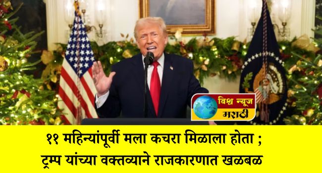 वॉशिंग्टन प्रतिनिधी : अमेरिकेचे राष्ट्राध्यक्ष डोनाल्ड ट्रम्प पुन्हा एकदा आपल्या वादग्रस्त वक्तव्यामुळे चर्चेत आले आहेत. देशाला संबोधित करताना ट्रम्प यांनी केलेल्या “अकरा महिन्यांपूर्वी मला कचरा मिळाला होता आणि तोच मी साफ करत आहे,” या विधानामुळे अमेरिकेच्या राजकीय वर्तुळात मोठी खळबळ उडाली आहे. राष्ट्राध्यक्षांनी थेट जनतेसमोर केलेल्या या वक्तव्याने विरोधकांसह सामान्य नागरिकांनाही आश्चर्याचा धक्का दिला आहे.