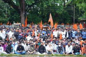 कोल्हापूर : मराठा समाजाला आरक्षण मिळविण्यासाठी खासदार छत्रपती संभाजी राजे यांच्या नेतृत्वात आज कोल्हापूरात मूक आंदोलन करण्यात आला. या मूक आंदोलनात विविध राजकिय पक्षाचे नेते उपस्थित होते. यामध्ये भाजपचे प्रदेशाध्यक्ष चंद्रकांत पाटील, वंचित बहुजन आघाडीचे नेते प्रकाश आंबेडकर, कोल्हापूरचे पालकमंत्री सतेज पाटील, ग्रामविकास मंत्री हसन मुश्रीफ, खासदार धैर्यशील माने यांच्यासह अनेक नेते उपस्थित होते.
