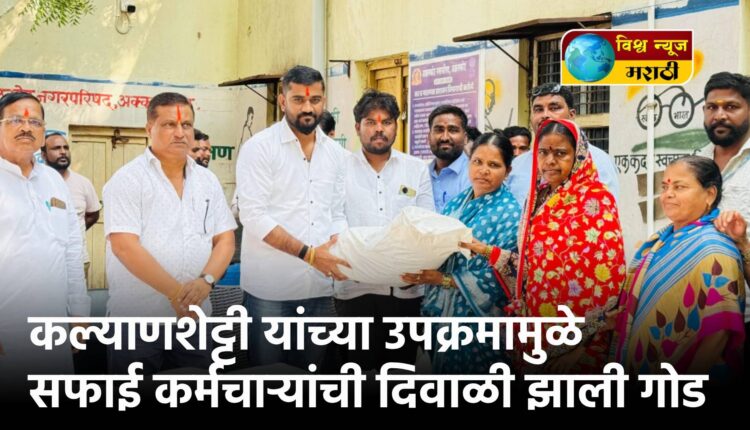 अक्कलकोट नगरपरिषदेतील सुमारे सव्वा दोनशे सफाई कर्मचाऱ्यांना दिवाळी किट वाटप करण्यात आले. हा उपक्रम आमदार सचिन कल्याणशेट्टी यांच्या मार्गदर्शनाखाली माजी नगरसेवक मिलन कल्याणशेट्टी यांच्या हस्ते पार पडला. सामाजिक बांधिलकी जपत दरवर्षी हा उपक्रम राबविण्यात येतो.