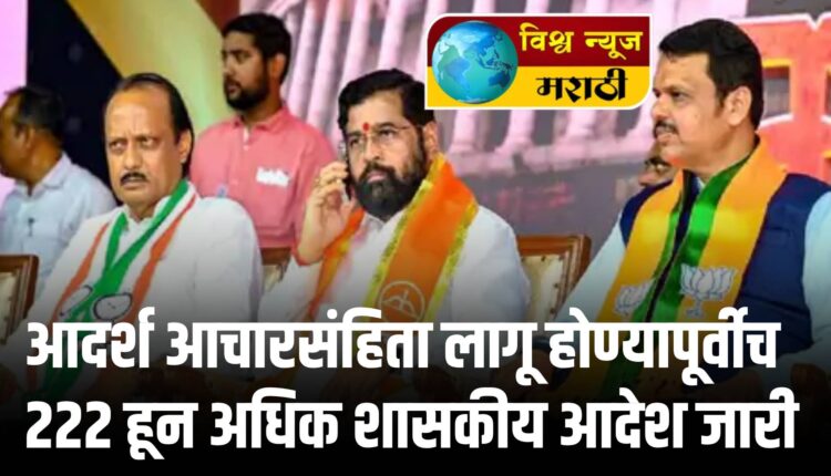 राज्यात महायुती सरकारने मंगळवारी आदर्श आचारसंहिता लागू होण्यापूर्वी २२२ हून अधिक शासकीय आदेश जारी केले. सकाळी १० ते संध्याकाळी ६ या ८ तासात सुमारे २२२ सरकारी आदेश जारी करण्यात आले. अशा प्रकारे महायुती सरकारने आपल्या कार्यकाळाच्या शेवटच्या दिवशी मंगळवारी तासाला सरासरी २७ शासकीय आदेश जारी केले. दरम्यान,सरकारने २७२ आमदारांना प्रत्येकी ४० लाखांचाही निधीही जाहीर केला.