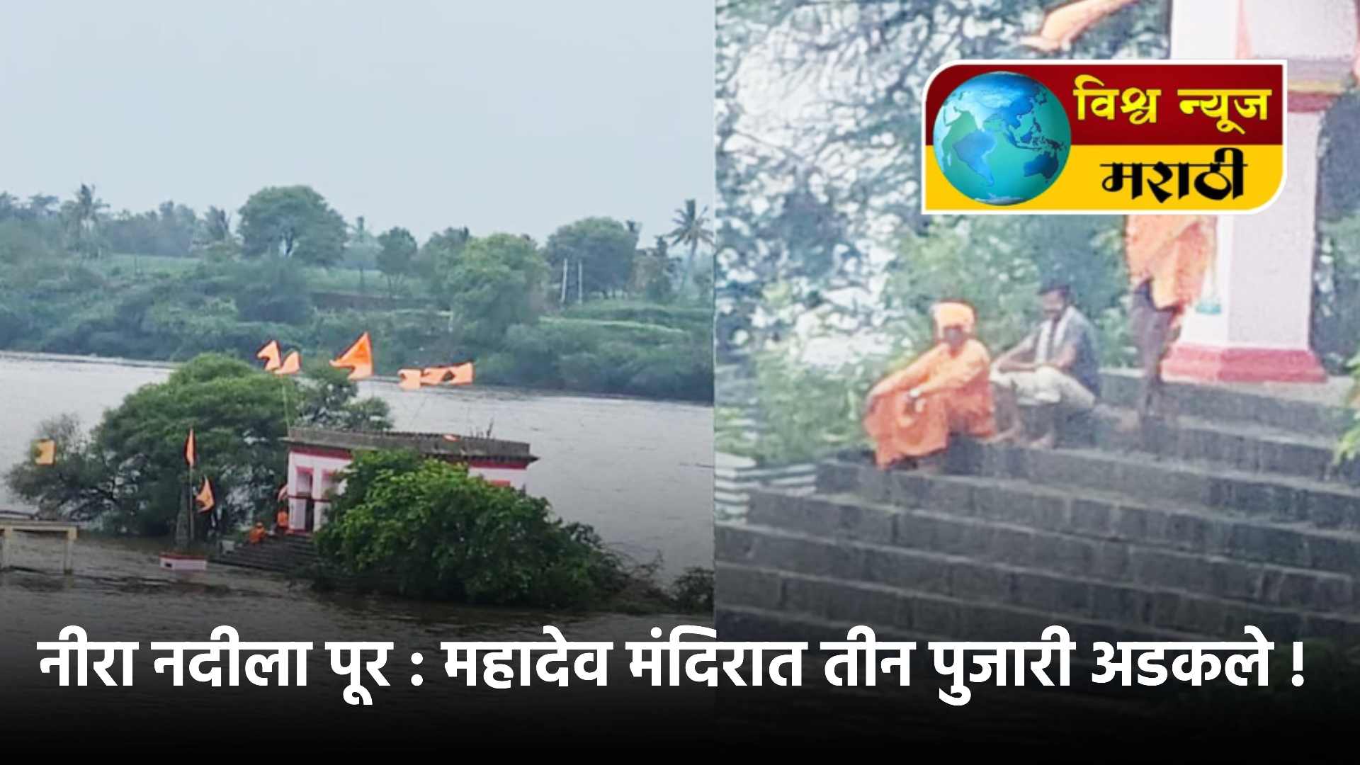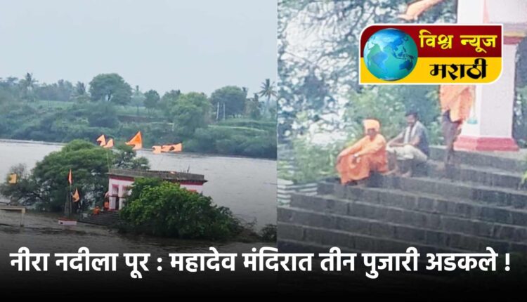 राज्यातील अनेक जिल्ह्याला हवामान विभागाने रेड अलर्ट दिला होता आता त्यानंतर सोलापूर जिल्ह्यातील वीर नदी खोऱ्यात झालेल्या मुसळधार पावसामुळे नीरा नदीला पूर आला आहे. या नीरा नदीचे पाणी भीमा नदीला मिळत असल्याने भीमा नदीला पूर सदृष्य परिस्थिती निर्माण झाली आहे. दरम्यान, भीमा नदीपात्रातील पिराची कुरोली, गुरसाळे, पंढरपूर, गोपाळपूर, मुंढेवाडी, पुळुज हे बंधारे पाण्याखाली गेले आहेत, तर गुरसाळे येथील भीमा नदी पात्रात असलेल्या महादेव मंदिरात तीन महाराज अडकले होते.