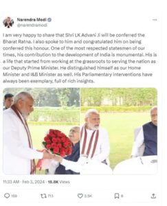 मोदींनी लिहिले की, ‘मला कळवताना अतिशय आनंद होत आहे की लालकृष्ण अडवाणी यांना भारतरत्न देण्यात येणार आहे. मी त्यांच्याशी बोललो आणि अभिनंदन केले. ते आपल्या काळातील सर्वात आदरणीय राजकारणी आहेत. देशाच्या विकासात त्यांनी दिलेले योगदान कोणीही विसरू शकत नाही. तळागाळातून कामाला सुरुवात करून त्यांनी देशाच्या उपपंतप्रधानपदापर्यंत मजल मारली. ते देशाचे गृहमंत्री आणि माहिती व प्रसारण मंत्रीही होते. त्यांची संसदीय कार्यशैली नेहमीच अनुकरणीय राहील.