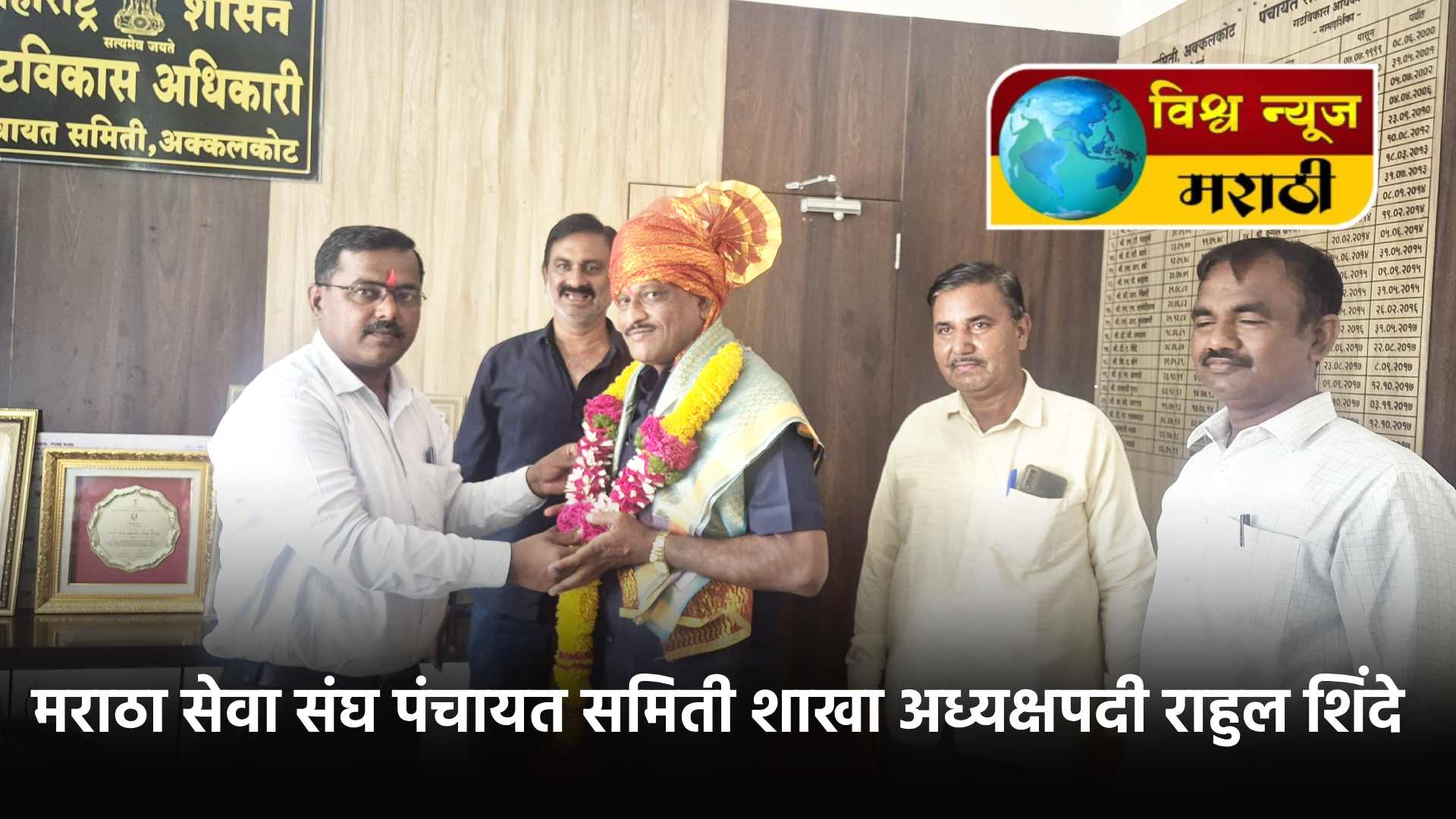 मराठा सेवा संघ जिल्हा परिषद शाखा अंतर्गत पंचायत समिती शाखा अध्यक्ष म्हणून अक्कलकोट पंचायत समिती शाखा अध्यक्षपदी राहुल शिंदे यांची निवड करण्यात आली आहे.दरम्यान ही निवड पुढील तीन वर्षासाठी करण्यात आली आहे. मराठा सेवा संघ अक्कलकोट अध्यक्षपदी निवड झाल्या बद्दल गटविकास अधिकारी शंकर कवितके यांच्या हस्ते सत्कार करण्यात आला.