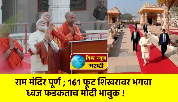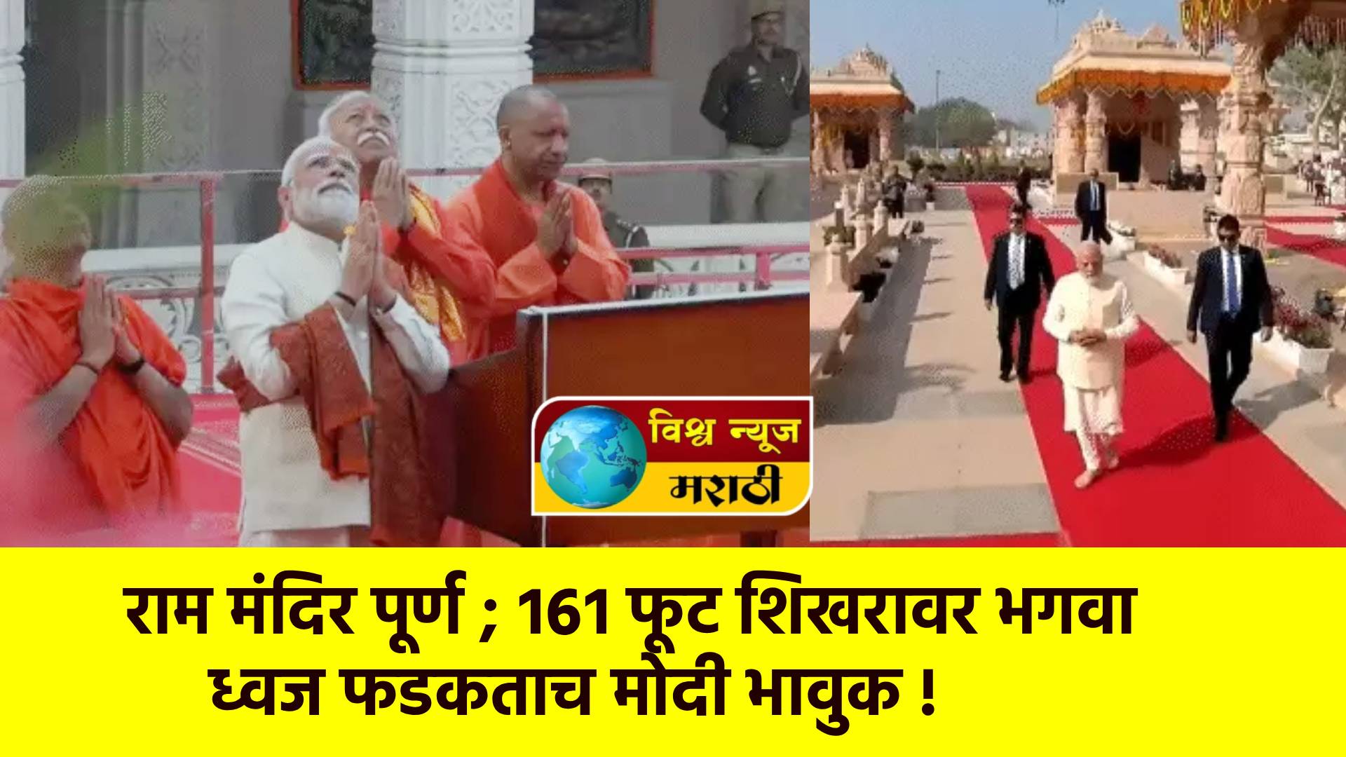 रामलल्लाच्या प्राणप्रतिष्ठेनंतर ६७३ दिवसांनी अयोध्येत इतिहास घडला. अभिजित मुहूर्तात, सकाळी ११:५० वाजता, पंतप्रधान नरेंद्र मोदी आणि राष्ट्रीय स्वयंसेवक संघाचे प्रमुख मोहन भागवत यांच्या हस्ते राम मंदिराच्या १६१ फूट उंच शिखरावर भगवा ध्वज फडकवण्यात आला. बटण दाबताच २ किलोचा धर्मध्वज आकाशात फडकला आणि राम मंदिराचे संपूर्ण काम पूर्ण झाल्याची घोषणा झाली. या क्षणी पंतप्रधान मोदी भावुक झाले आणि हात जोडून धर्मध्वजाला अभिवादन केले.