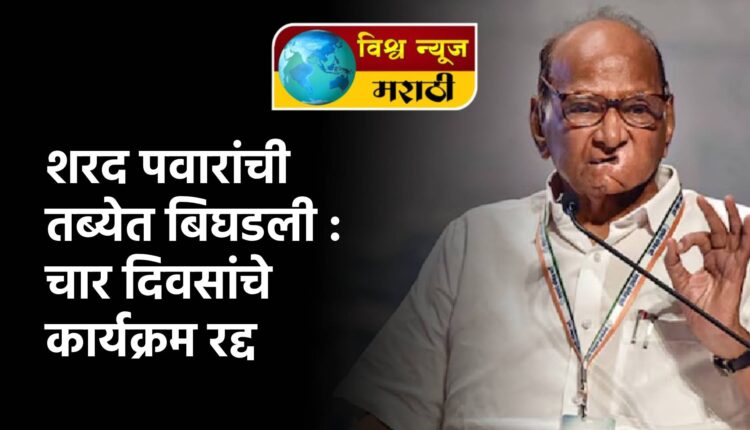राष्ट्रवादी काँग्रेस शरदचंद्र पवार पक्षाचे प्रमुख शरद पवार गेली दोन दिवस कोल्हापूर, सांगली जिल्ह्याच्या दौऱ्यावर होते. या दौऱ्यादरम्यानच्या कार्यक्रमांत बोलताना त्यांना खोकल्यामुळे त्रास जाणवत होता. आताही त्यांची तब्येत ठीक नसल्याने त्यांचे पुढील ४ दिवसांचे कार्यक्रम रद्द करण्यात आले आहेत.