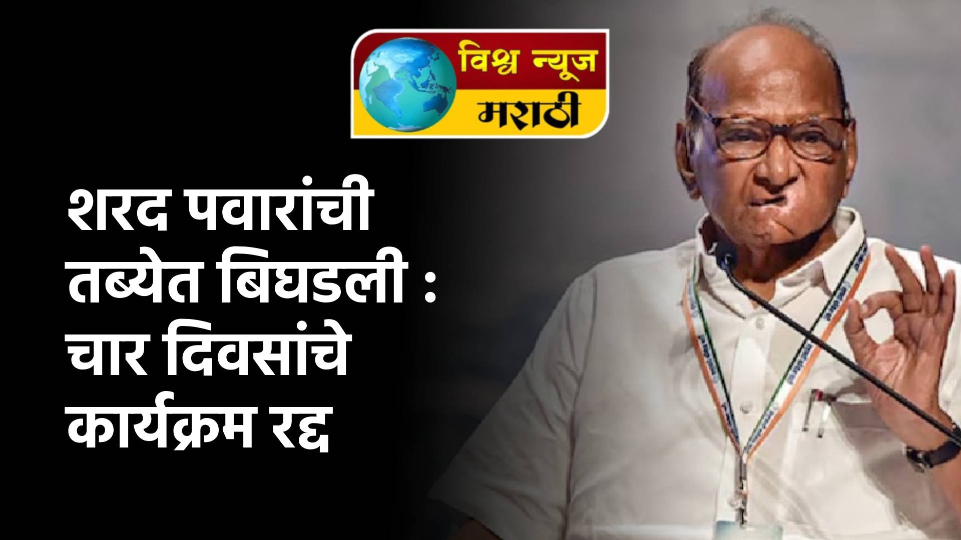 राज्यातील महाविकास आघाडीचे नेते व ज्येष्ठ नेते शरद पवार यांची तब्येत बरी नसल्याने त्यांचे पुढील ४ दिवसांचे सर्व कार्यक्रम रद्द करण्यात आले आहेत. त्यांना खोकल्यामुळे कार्यक्रमात बोलताना त्रास होत आहे. यामुळे पुढील ४ दिवसांचे त्यांचे सर्व कार्यक्रम रद्द करण्यात आले असल्याचे राष्ट्रवादी काँग्रेस शरदचंद्र पवार पक्षाकडून सांगण्यात आले आहे.