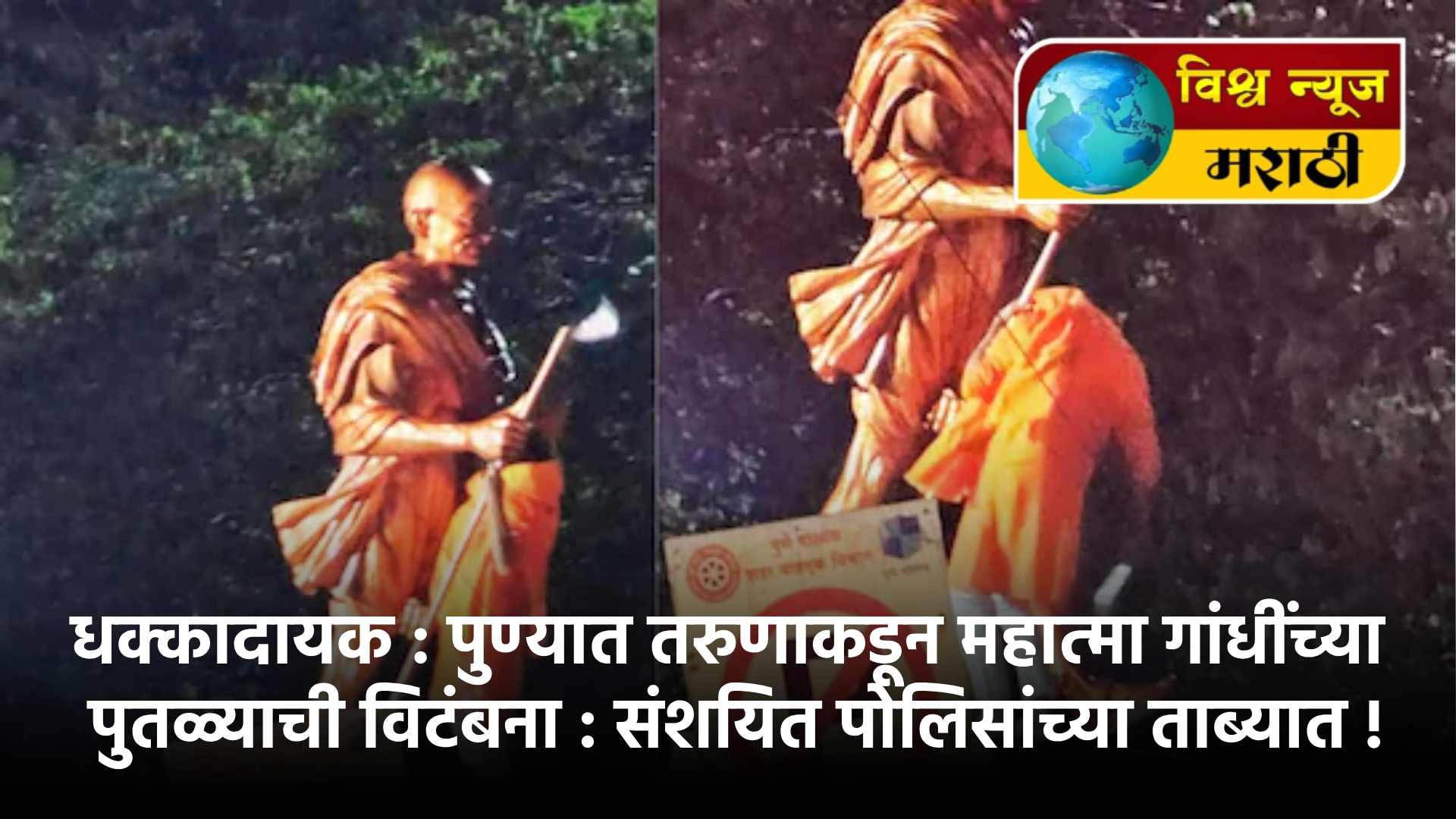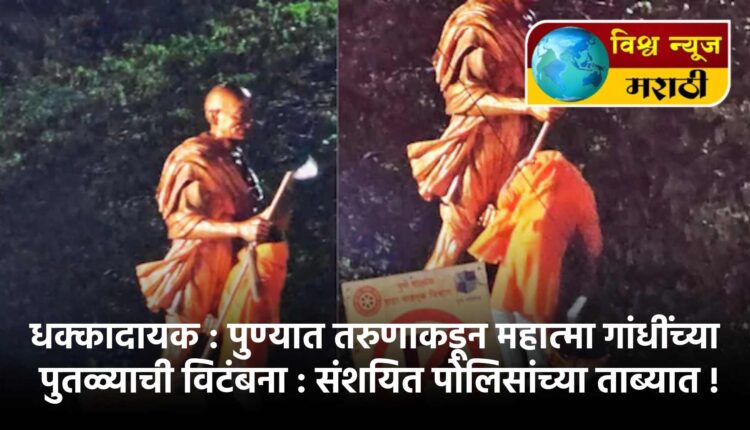 राज्यातील पुणे शहरात रविवारी रात्रीच्या सुमारास सुरज शुक्ला नामक तरुणाने भगवे वस्त्र परिधान करत महात्मा गांधींच्या पुतळ्यावर कोयत्याने वार केल्याची धक्कादायक घटना घडली. या घटनेमुळे शहरात एकच खळबळ उडाली असून तणाव निर्माण झाला आहे. सुरज शुक्ला या तरुणाला पोलिसांनी अटक केली असून, घटनेनंतर कॉंग्रेस आक्रमक झाल्याचे पाहायला मिळत आहे.