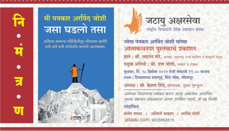 सोलापूर : सोलापूरचे जेष्ठ पत्रकार अरविंद जोशी यांच्या, ‘मी पत्रकार अरविंद जोशी : जसा घडलो तसा’ या आत्मकथनपर पुस्तकाचे प्रकाशन बुधवार दिनांक २८ डिसेंबर रोजी सकाळी अकरा वाजता शिवस्मारक सभागृह, शिंदे चौक सोलापूर येथे महाराष्ट्र राज्य साहित्य संस्कृती मंडळाचे अध्यक्ष आणि जेष्ठ साहित्यिक संशोधक डॉ. सदानंद मोरे यांच्या हस्ते होणार आहे.
