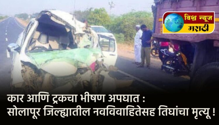 भरधाव कार आणि ट्रकच्या झालेल्या भीषण अपघातात कारमधील नवविवाहितेसह तिघांचा मृत्यू झाला आहे. हा अपघात पुणे-सोलापूर 1 महामार्गावर भिगवणनजीक स्वामी चिंचोली (ता. दौंड) गावाच्या हद्दीत मंगळवारी सकाळी साडेसातच्या सुमारास घडला. या घटनेत दोन जण गंभीर जखमी आहेत.