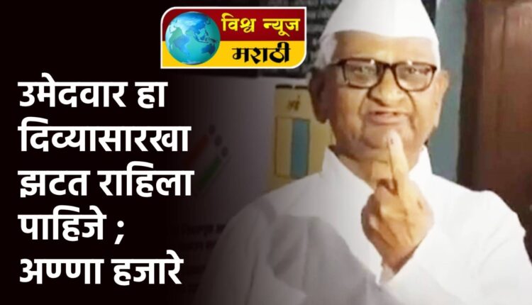 राज्यात लोकसभा निवडणुकीसाठी आज अनेक जिल्ह्यात मतदान सुरु असून यावेळी अहमदनगर लोकसभा मतदारसंघात महायुतीचे उमेदवार सुजय विखे पाटील यांच्या विरोधात महाआघाडीचे उमेदवार नीलेश लंके असा सामना रंगला आहे. या मतदार संघात समाज सेवक अण्णा हजारे यांचे राळेगण सिद्धी हे गाव देखील येते. अण्णा हजारे यांनी देखील आपल्या मतदानाचा हक्क बजावला. या वेळी त्यांनी मतदारांना कोणत्या उमेदवार मतदान करावे, याचा सल्ला देखील दिला आहे. कोणताही पक्ष आणि व्यक्तीला न पाहता मतदान करताना उमेदवार हा चारित्र्यशील, विचारशील तसेच निष्कलंक असला पाहिजे, अशा उमेदवाराला मतदान करण्याचे आवाहन अण्णा हजारे यांनी केले आहे. उमेदवारामध्ये अपमान सहन करण्याची शक्ती असेल, त्याच उमेदवाराला मतदान करण्याचे आवहन देखील त्यांनी केले आहे. उमेदवार हा दिव्यासारखा झटत राहिला पाहिजे, असे देखील अण्णा हजारे यांनी म्हटले आहे.
