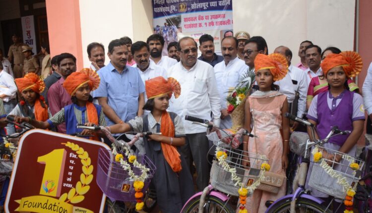 सोलापूर, दि.4 : जिल्हा परिषद कर्मचारी सहकारी पतसंस्था क्रमांक 1 चे नंबर वन फाउंडेशनच्या वतीने जिल्हा परिषदेच्या मुलींसाठी सुरू केलेल्या सायकल बँक उपक्रमाला 100 सायकली देण्यात आल्या. त्यातील प्राधिनिधीक स्वरूपात 11 सायकलींचे वाटप महसूल, पशुसंवर्धन, दुग्ध व्यवसाय विकास मंत्री तथा पालकमंत्री राधाकृष्ण विखे-पाटील यांच्या हस्ते मुलींना वाटप करण्यात आले.