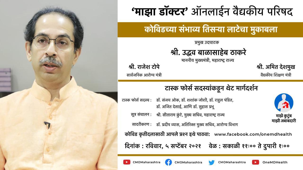 कोविडच्या तिसऱ्या लाटेबाबत रविवारी टास्क फोर्सची ‘माझा डॉक्टर’ ऑनलाईन वैद्यकिय परिषद; राज्यातील सर्व डॉक्टर्स होणार सहभागी, मुख्यमंत्री उद्धव ठाकरे करणार उद्घाटन समाज माध्यमातून प्रसारण, चर्चा सर्वांना पाहता येणार