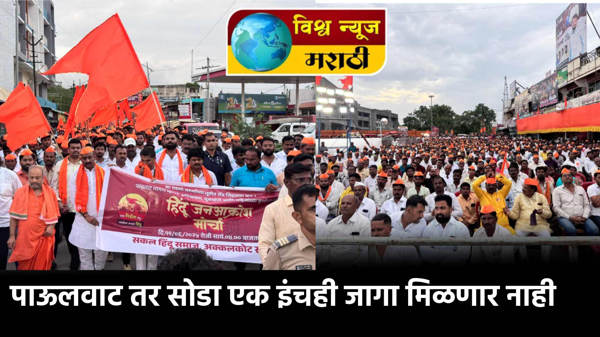 मोर्चा संपला म्हणजे काम संपले, असे समजू नका. अनेक देवस्थानांवर अतिक्रमण होत आहे. बेकायदेशीर गोष्टी करण्यासाठी पाऊलवाट मागणाऱ्यांची  मागणी बेकायदेशीर आहे. ती कोणत्याही परिस्थितीत मान्य केली जाणार नाही. छत्रपतींच्या विचारांना धरूनच सरकार चालले आहे.बस स्थानकाच्या पाठीमागील बाजूला जे अतिक्रमण आहे.त्यावर देखील बुलडोझर फिरवला जाईल, असेही  त्यांनी स्पष्ट केले.यावेळी आमदार सचिन कल्याणशेट्टी यांनीही आपल्या भाषणात ठाम भूमिका मांडली.अक्कलकोट ही स्वामी समर्थांची पवित्र भूमी आहे. या ठिकाणी राज्यभरातून लाखो भाविक येतात. त्यामुळे हे बस स्थानक चांगले आणि सुरक्षित व्हावे, हा आमचा प्रयत्न आहे. मात्र, या कामात अनेक अडथळे निर्माण करण्यात आले. आता पुन्हा पाऊलवाट सोडण्याची मागणी होत आहे, जी पूर्णतः बेकायदेशीर आहे. हे प्रकरण १९९८ पासून सुरू झाले आहे. त्यावेळी वाट सोडली  नसती तर आज ही वेळ आली नसती. मुळात मागणी बेकायदेशीर असून मागील बाजूसही मोठ्या प्रमाणावर अतिक्रमण झाले आहे. पर्यायी रस्ता असतानाही पाऊल वाटेसाठी अट्टाहास का ? असा सवाल त्यांनी उपस्थित केला.हे आम्ही कदापि होऊ देणार नाही,असा निर्धार त्यांनी व्यक्त केला.आमदार देवेंद्र कोठे यांनीही आपल्या भाषणातून आपली भूमिका स्पष्ट करत म्हणाले, देव, देश आणि धर्म हेच आमचे मूल्य आहेत. आम्ही कधीही त्यांना धक्का लागू देणार नाही. आमदार कल्याणशेट्टी यांच्या माध्यमातून लाखो रुपयांचा खर्च करून बस स्थानक उभे राहत असताना जिहादी प्रवृत्तीच्या लोकांनी त्यात अडथळा निर्माण केला आहे. पर्यायी रस्ता असूनही ही मागणी पुढे का आली, असा सवालही त्यांनी उपस्थित केला. यासाठी आम्ही मुख्यमंत्री यांच्याकडे मागणी लावून धरणार आहोत. शिवाय या बस स्थानकाला धर्मवीर छत्रपती संभाजी महाराजांचे नाव देण्यात यावे, अशी आग्रही मागणी त्यांनी मांडली.अंबादास गोरटला यांनीही पाऊलवाटीची मागणी चुकीची असून ती कदापि सहन केली जाणार नाही,या ठिकाणी केवळ अवैध धंदे आणि अतिक्रमण करण्यासाठीच ही मागणी होत आहे,असे स्पष्ट केले. हिंदू धर्मावर होणारा अन्याय सहन केला जाणार नाही. जिथे अन्याय तिथे आम्ही उभे राहू.या पाऊलवाटेमुळे बस स्थानकाची सुरक्षा धोक्यात येणार आहे, त्यामुळे वेळेत सावध होणे आवश्यक आहे, असे ते म्हणाले.या सभेला श्री नीलकंठ शिवाचार्य महास्वामीजी,म. नि. प्र बसवलिंग महास्वामीजी यांचीही उपस्थिती होती. सभा सुरू होण्यापूर्वी श्री स्वामी समर्थ, छत्रपती शिवाजी महाराज आणि श्रीराम यांच्या प्रतिमेचे पूजन करून कार्यक्रमाची सुरुवात करण्यात आली. या सभेला शहर व तालुक्यातील हिंदू बांधव मोठ्या संख्येने उपस्थित होते.