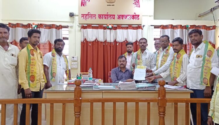 अक्कलकोट दि . ०४ :राष्ट्रीय समाज पक्षाचे अध्यक्ष महादेव जानकर यांच्या आदेशानुसार राष्ट्रीय समाज पक्ष अक्कलकोट शहर व तालुका कार्यकारिणीच्यावतीने कांद्याला अनुदान द्यावे किंवा हमीभाव द्यावा या मागणीसाठी तहसीलदार बाळासाहेब सिरसट यांना निवेदन देण्यात आले.