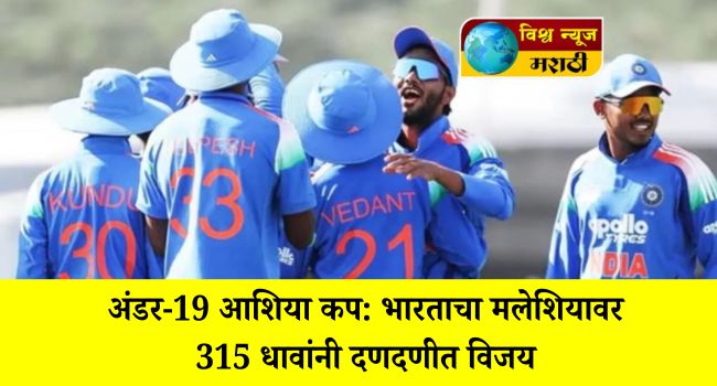 मुंबई प्रतिनिधी : अंडर-19 आशिया कप स्पर्धेत भारताने मलेशियाचा 315 धावांनी पराभव करत स्पर्धेत विजयांची हॅटट्रिक साजरी केली. प्रथम फलंदाजी करत भारताने 7 बाद 408 धावांचा डोंगर उभारला, तर प्रत्युत्तरादाखल मलेशियाचा संघ अवघ्या 93 धावांत गडगडला. हा विजय अंडर-19 आशिया कपच्या इतिहासातील धावांच्या बाबतीत दुसरा सर्वात मोठा विजय ठरला.