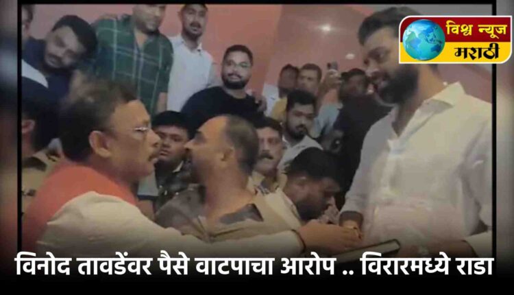 विरारमध्ये एका हॉटेलमध्ये विनोद तावडे पैसे वाटत असल्याचा आरोप बहुजन विकास आघाडीने केला आहे. बविआ कार्यकत्यांनी घेरल्याचे व्हिडिओ समोर आले आहेत. त्यावरून जोरदार राडा सुरू आहे. कार्यकर्त्यांकडून तावडेंना घेरण्यात आले होते. दरम्यान पोलिसांनी या हॉटेलचा ताबा घेतला आहे. तावडेंनी मात्र या आरोपांचे खंडन केले आहे. याठिकाण पोलिस दाखल झाले असून बविआ आणि भाजपच्या कार्यकर्त्यांना आवरण्याचा प्रयत्न करत आहेत.