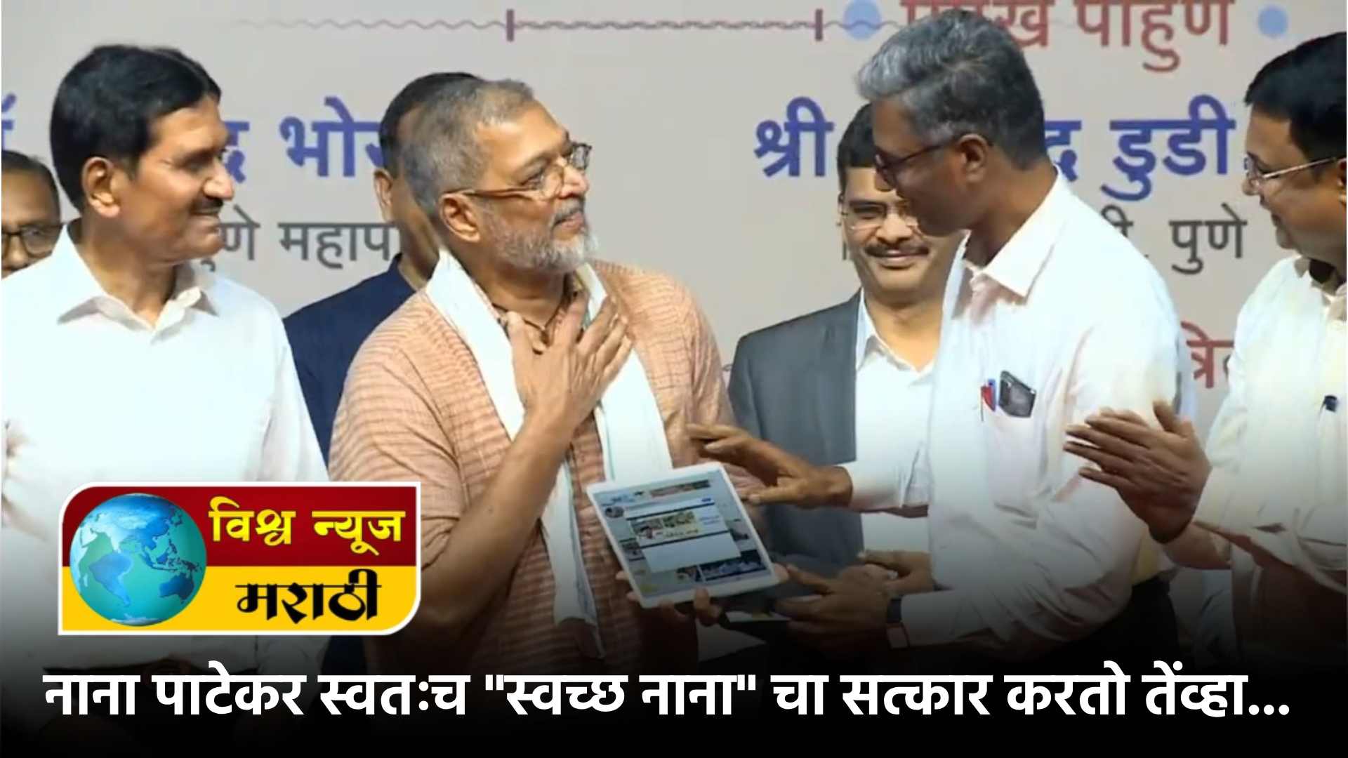 मकरंद अनासपुरे यांच्या संगतीने “नाम फाउंडेशन” च्या माध्यमातून देशापुढे जलसंवर्धन आणि ग्रामविकासाचा आदर्श ठेवणारा आणि बॉलीवूडमध्ये “नाना”नावाचा मराठी दबदबा निर्माण करणारा नाना पाटेकर! हाच नाना आपला मान समाजसेवा आणि प्रशासकीय सेवेत इतिहास घडवित असलेल्या दुसऱ्या “स्वच्छ नाना”ला देवून त्याचा सन्मान करतो आणि टाळ्यांच्या कडकडाटाने बालगंधर्व रंगमंदिर दुमदुमून जाते!