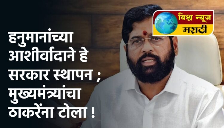 यावेळी मुख्यमंत्री शिंदे म्हणाले कि, दोन वर्षांपूर्वी ज्यांनी हनुमान चालिसा पठणाला विरोध केला, त्यांच्या सत्तेच्या लंकेचे हनुमानाच्या कृपेने दहन झाले आणि राज्यात सत्ता परिवर्तन झाले. रामलल्ला व हनुमान यांच्या आशीर्वादानेच सर्वसामान्यांच्या मनातील सरकार महाराष्ट्रात स्थापन झाले. ज्यांनी १४ दिवस राणा दाम्पत्याला जेलमध्ये टाकले, त्यांची सत्ता बदलवण्याचे काम – मी केले, असा टोला देखील मुख्यमंत्री एकनाथ शिंदे यांनी माजी मुख्यमंत्री उद्धव ठाकरे यांना लगावला.